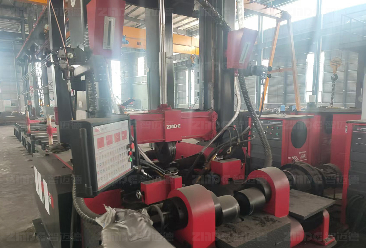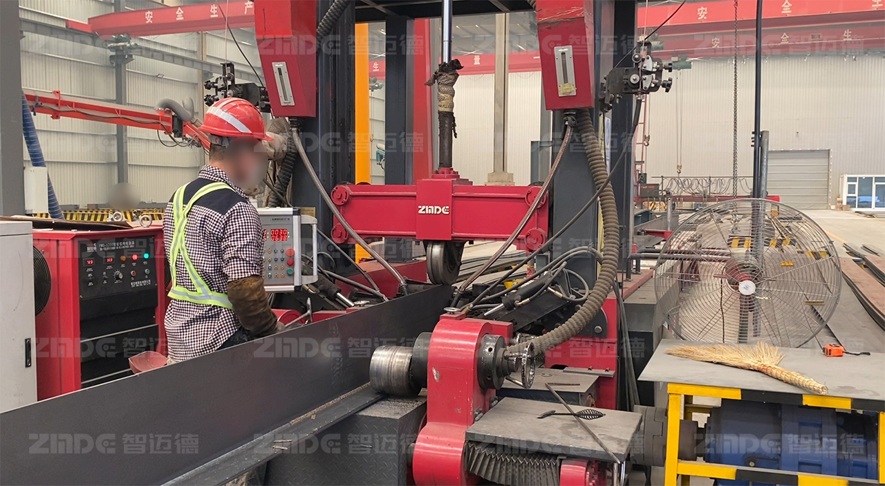 而組焊矯一體機(jī)的出現(xiàn),打破了這一困境。組焊矯一體機(jī)創(chuàng)新性地將組立、焊接、矯正三道工序集成在一臺(tái)設(shè)備上,僅需1~2人即可操作。設(shè)備設(shè)計(jì)精密、高度集成,通過(guò)智能化控制系統(tǒng),提升鋼結(jié)構(gòu)加工的精準(zhǔn)控制,并且可自動(dòng)對(duì)中,無(wú)需點(diǎn)焊,腹板18mm以下免坡口焊接,采用熱焊熱矯工藝,從頭焊到尾,在提高生產(chǎn)效率的同時(shí),有效提升了鋼構(gòu)件的產(chǎn)品品質(zhì)。與此同時(shí),搭配智邁德“烏騅”六極六弧焊機(jī)的組焊矯一體機(jī)可實(shí)現(xiàn)薄板、厚板的焊接,并可選配智邁德“絕影”三極三弧焊機(jī),實(shí)現(xiàn)焊接效率的大幅度提升。
